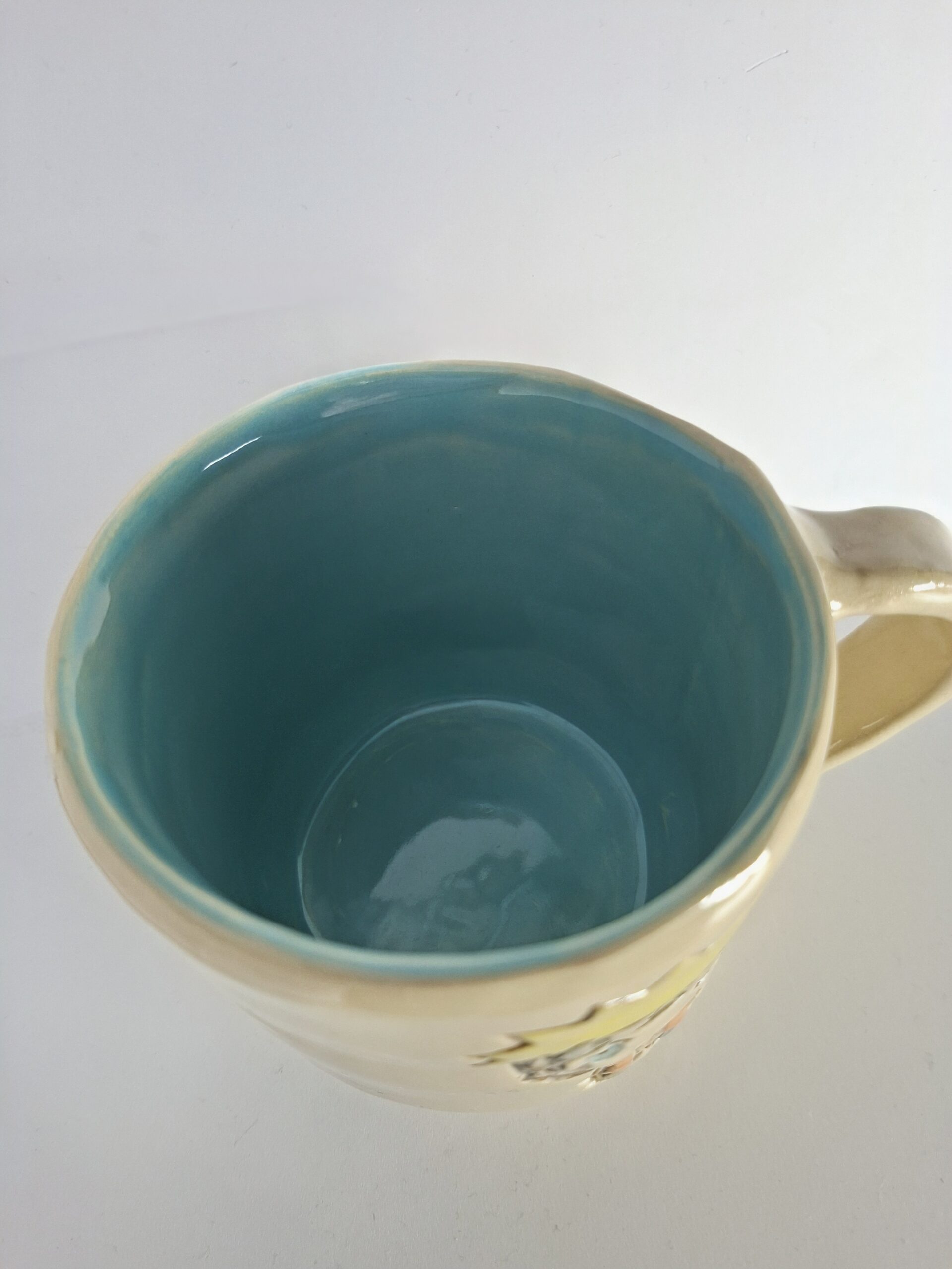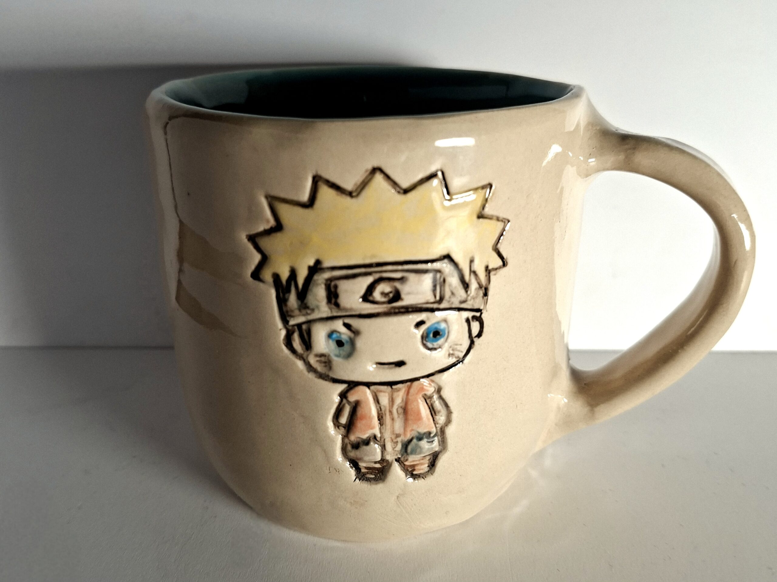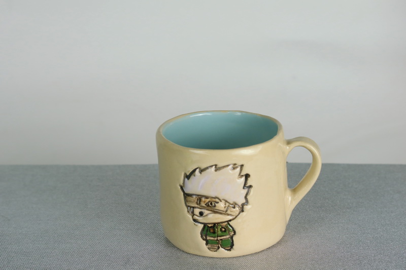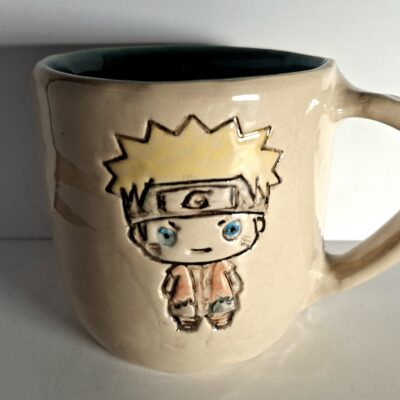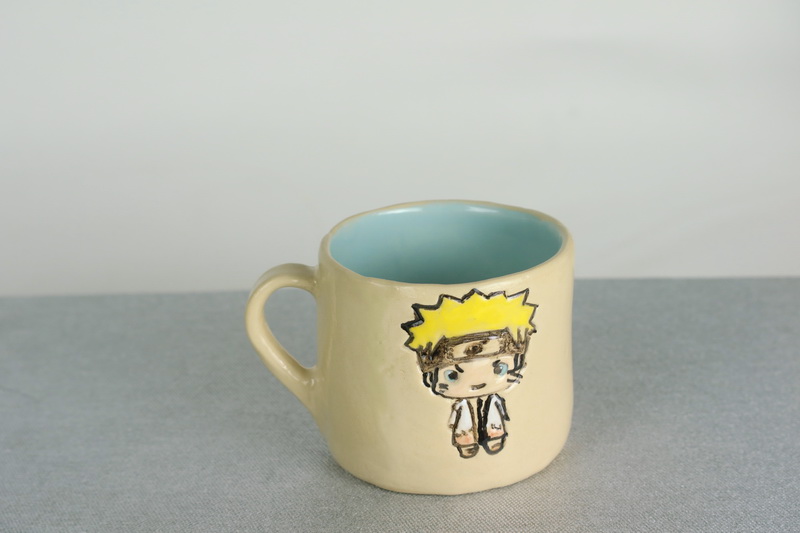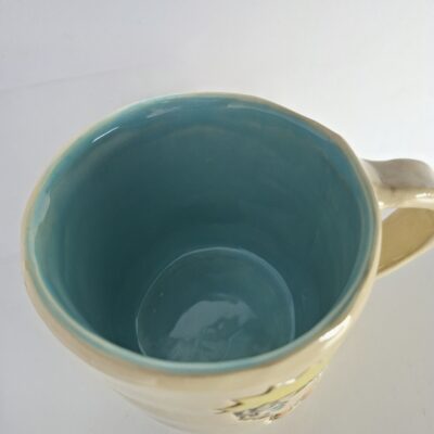 Materiał: jasna glina kamionkowa, farbki ceramiczne oraz szkliwa. Wypalanie dwukrotne: pierwsze w temperaturze 1000 i drugie w 1220 stopni Celsjusza. Solidny kubek z kamionki.