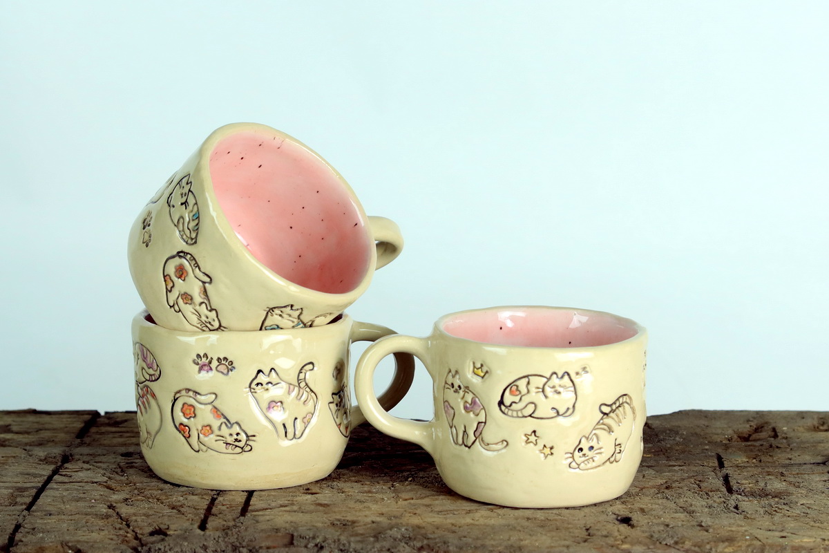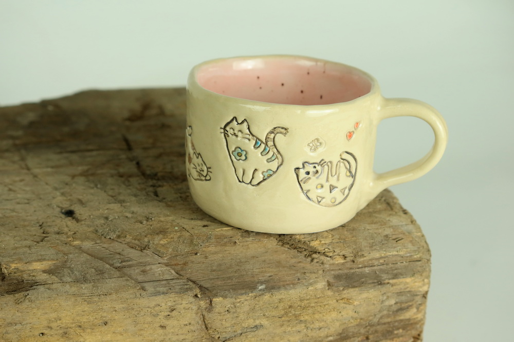 Materiał: jasna glina kamionkowa oraz szkliwa. Wypalanie dwukrotne: pierwsze w temperaturze 1000 i drugie w 1240 stopni Celsjusza. Solidny kubek z kamionki.
