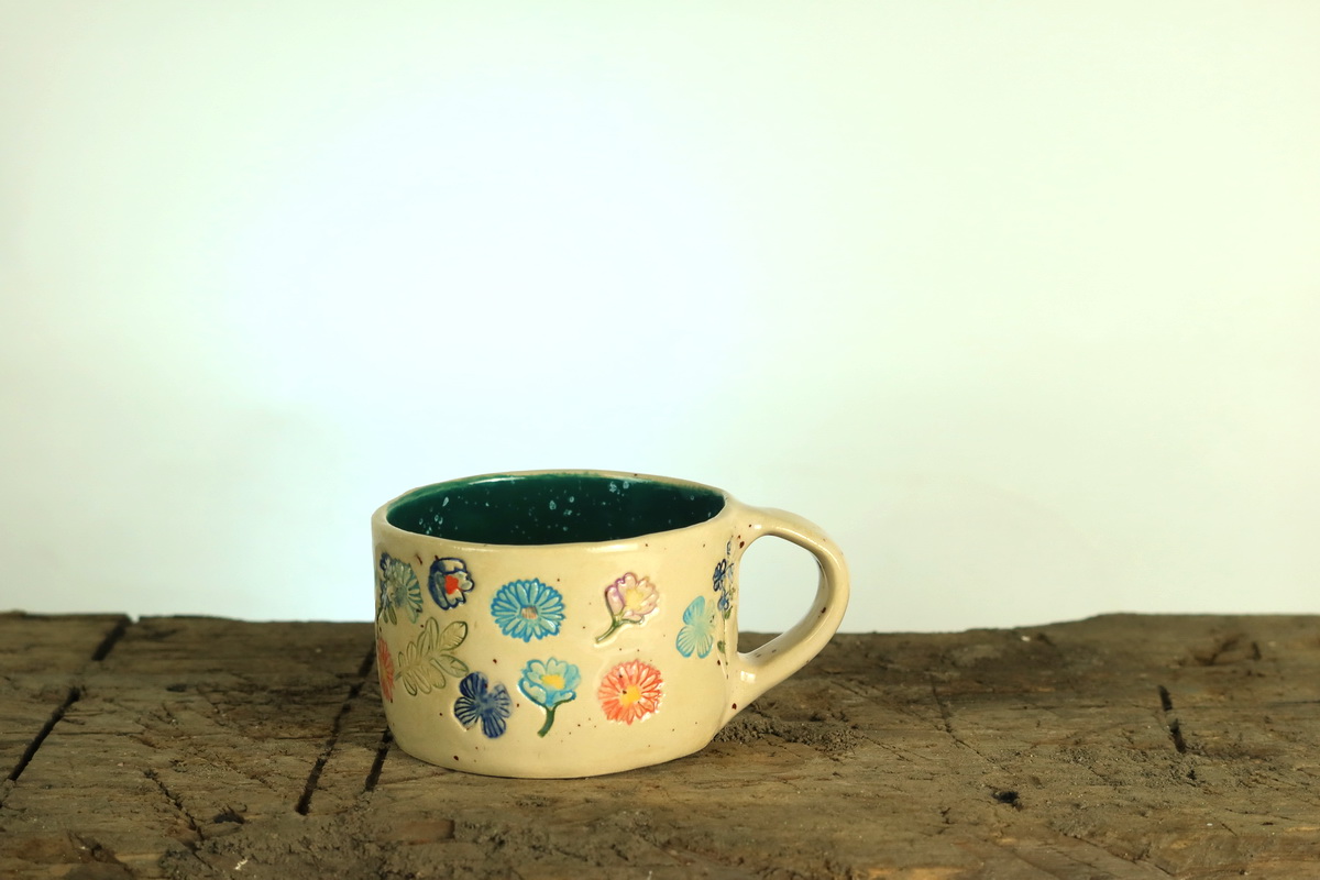 Materiał: jasna glina kamionkowa oraz szkliwa. Wypalanie dwukrotne: pierwsze w temperaturze 1000 i drugie w 1240 stopni Celsjusza. Solidny kubek z kamionki.